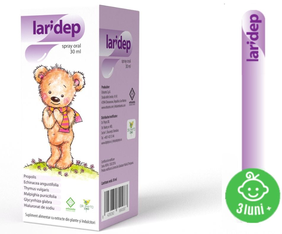 LARIDEP® spray oral este un supliment alimentar cu extracte din plante și îndulcitori ce conține un complex unic de fitoextracte standardizate pentru un efect antiinflamator, antiseptic, emolient și de apărare a mucoasei orofaringiene, fiind indicat în tratamentul inflamațiilor tractului orofaringian (faringite și laringite, amigdalite, stomatite, afte, herpangine, gingivite).