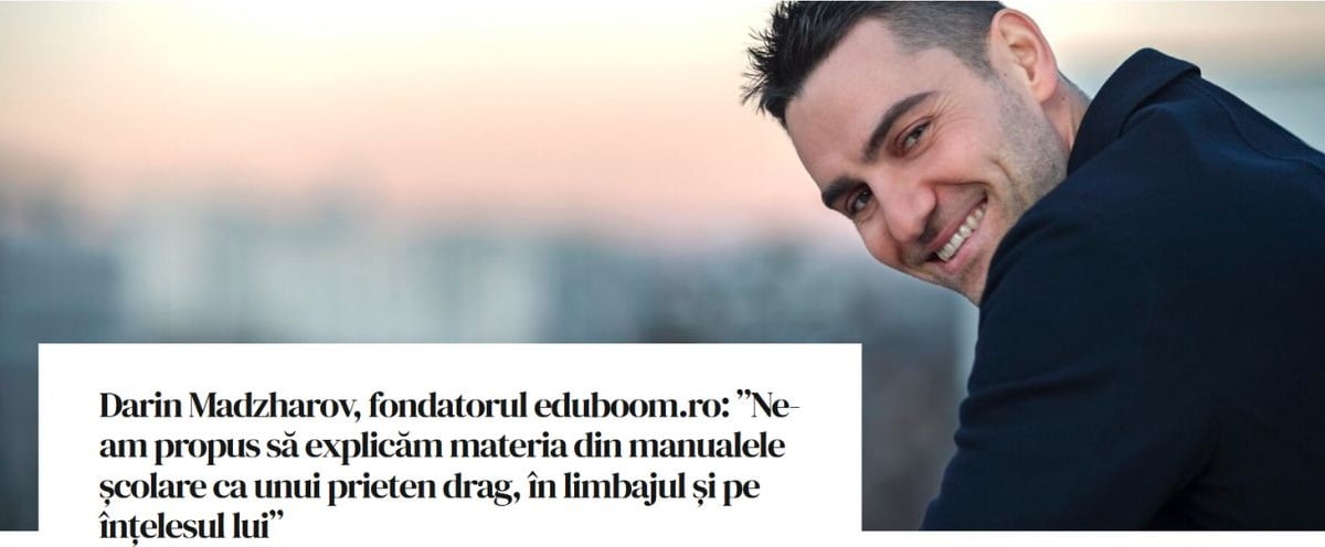 Eduboom nu este o simplă invenție tehnologică, ci rezultatul unei nevoi reale observate în educație. Povestea a început în 2011, în Bulgaria, unde Darin Madzharov, un tânăr doctorand în Belgia, încerca să-și ajute sora mai mică la teme. Pentru că întrebările ei se repetau, el a început să realizeze mici explicații video, folosind instrumente simple, precum Paint. Sora lui le-a arătat colegilor, iar reacțiile pozitive au fost imediate. Cererea a crescut, iar Darin a decis să renunțe la doctorat pentru a fonda Eduboom. Lecțiile create de el „ca pentru un prieten drag”, după cum povestește, s-au transformat într-o platformă folosită astăzi în peste 80% dintre școlile bulgare.