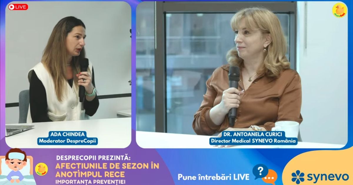Webinarul, moderat de Ada Chindea, a avut-o ca invitat pe Dr. Antoanela Curici, medic primar de medicină de laborator și Director Medical Synevo România, care a discutat despre prevenție, analize medicale esențiale, alimentație echilibrată și despre cum putem susține imunitatea copiilor în lunile de iarnă.